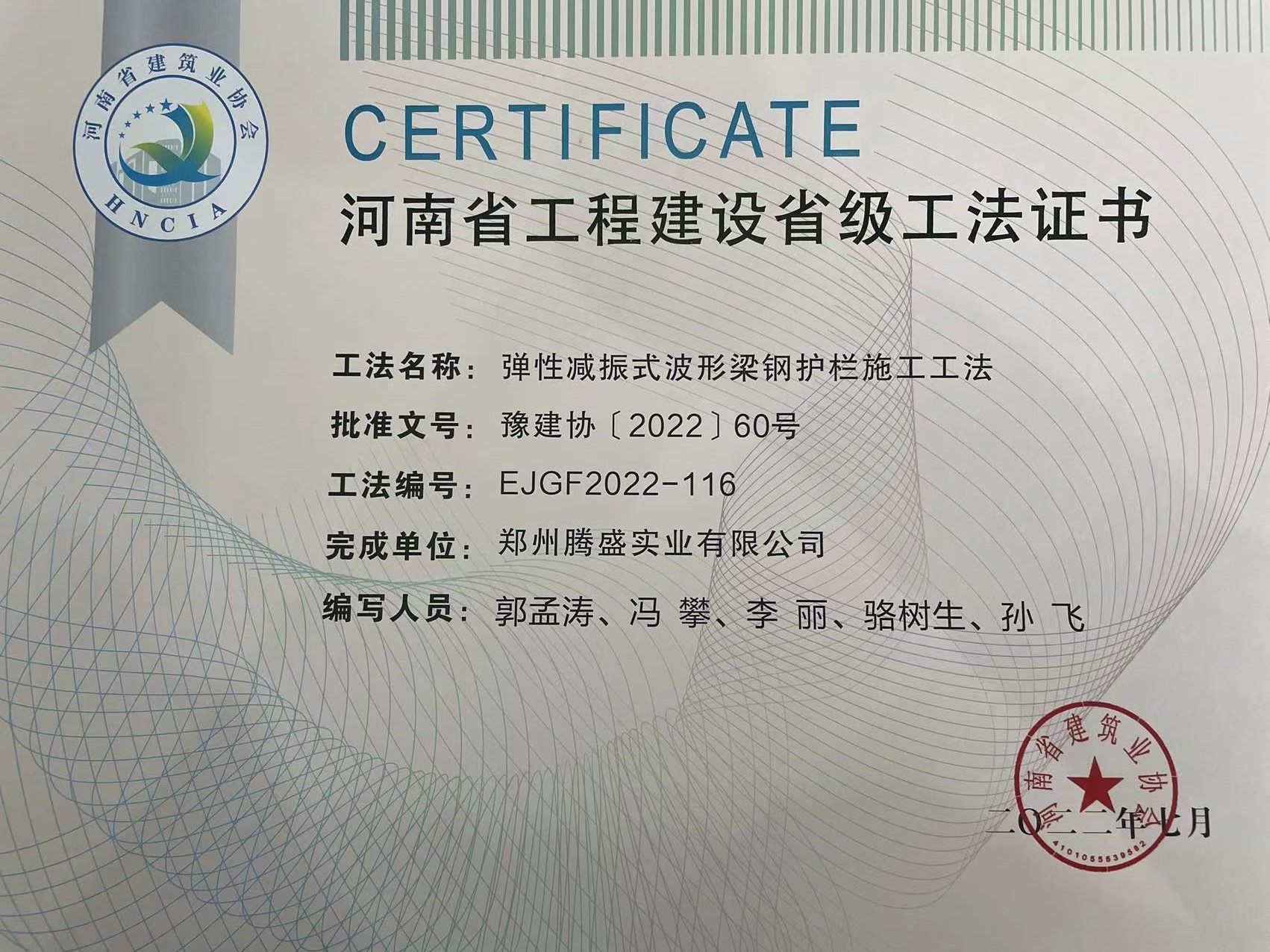 近日,我公司關(guān)于“彈性減震式波形梁鋼護(hù)欄施工工法”順利通過河南省建筑業(yè)協(xié)會批準(zhǔn),取得相應(yīng)省級工法證書,該工藝的順利批準(zhǔn),標(biāo)志著我公司在波形梁鋼...