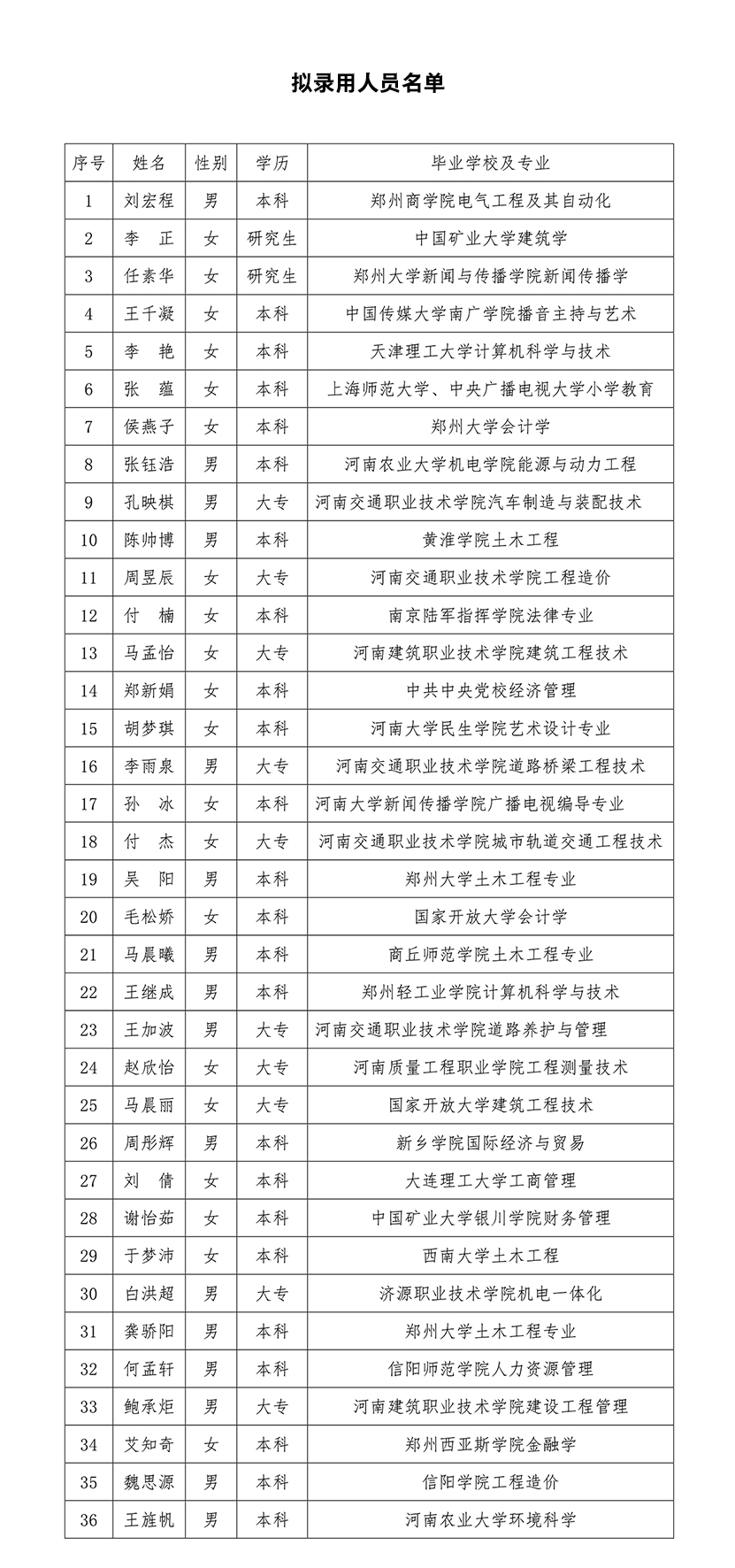 根據(jù)2023年度招聘計劃,經(jīng)筆試、面試及綜合素質評價,經(jīng)公司黨委會研究決定,擬錄用以下36名人員為我公司職工,試用期為3個月,試用期滿進行考核,考核結果為合格及以上將予以正式錄用,考核不合格的將解除勞動合同。